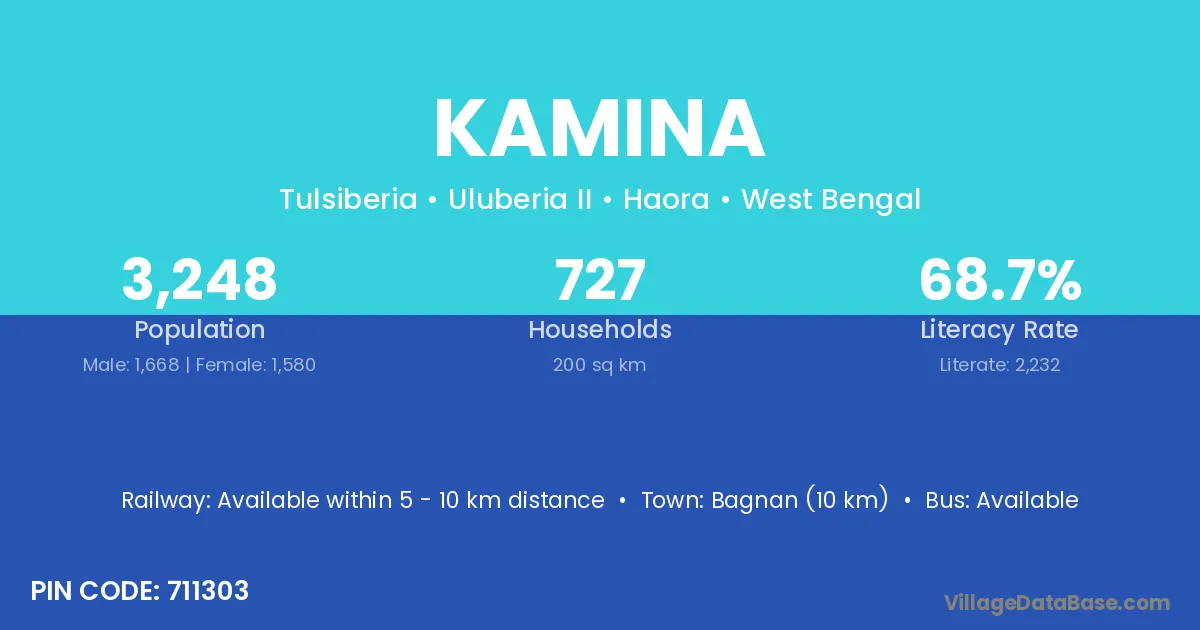 According to Census 2011 information, the village code of Kamina village is 711303.
