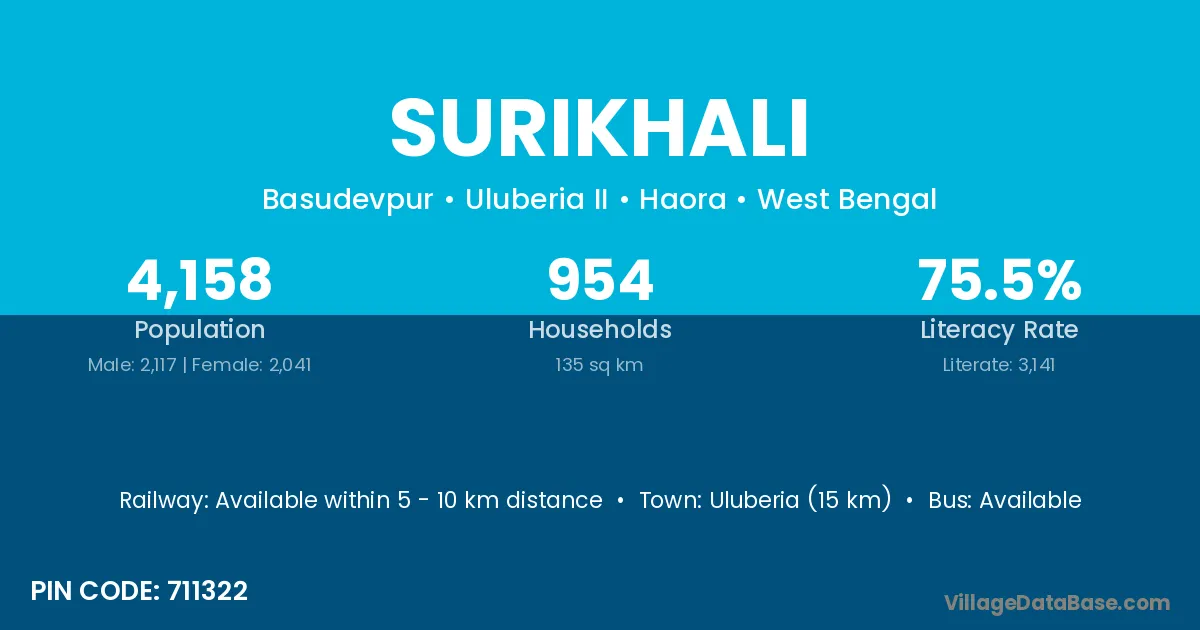 Uluberia (15 km) is the nearest town to Surikhali village for major economic activities and is located approximately 15 km away.