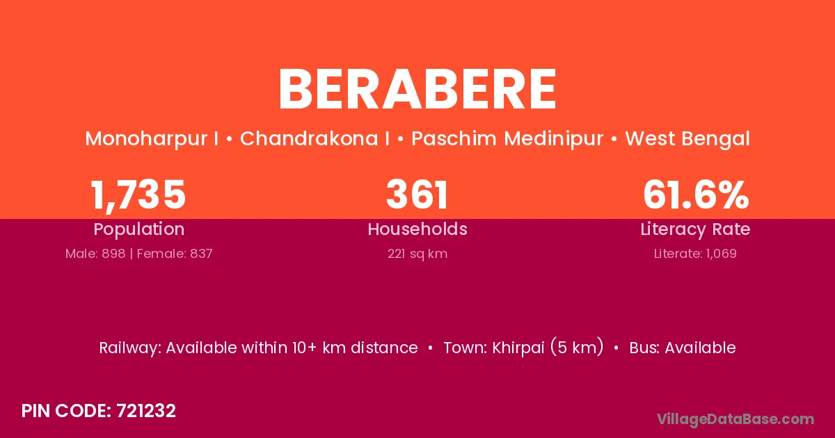 Arambagh (15 km) is the nearest town to Berabere village for major economic activities and is located approximately 15 km away.