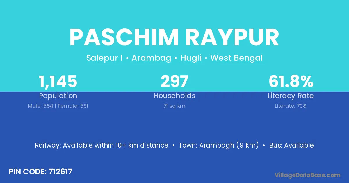 Arambagh (9 km) is the nearest town to Paschim Raypur village for major economic activities and is located approximately 9 km away.