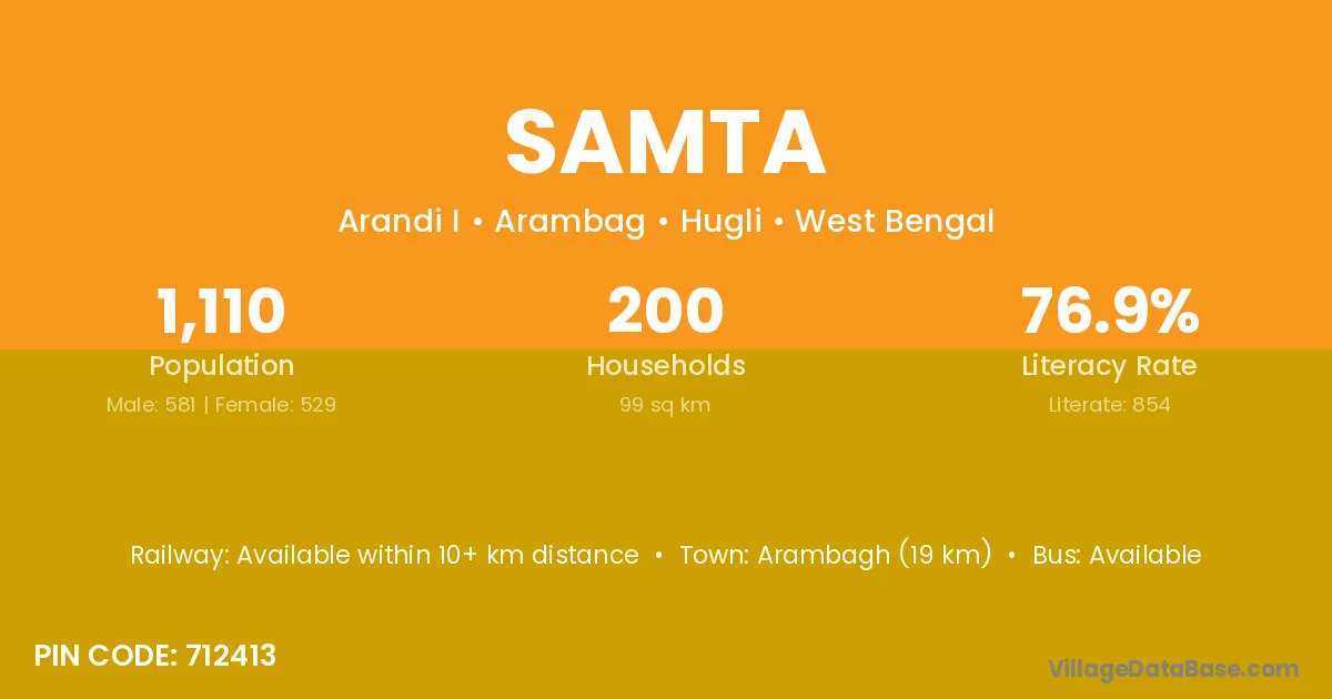 Arambagh (19 km) is the nearest town to Samta village for major economic activities and is located approximately 19 km away.