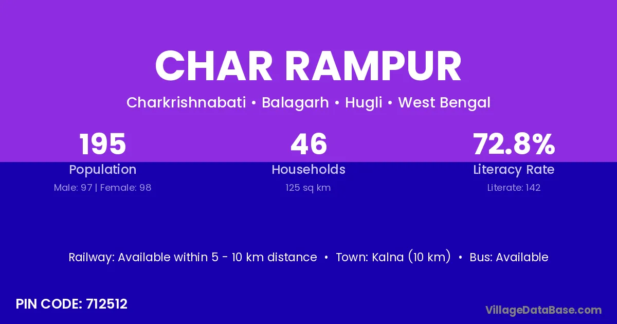 Kalna (10 km) is the nearest town to Char Rampur village for major economic activities and is located approximately 10 km away.