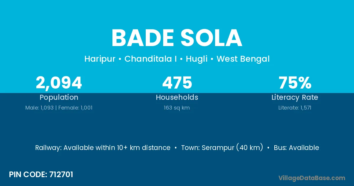 Serampur (40 km) is the nearest town to Bade Sola village for major economic activities and is located approximately 40 km away.