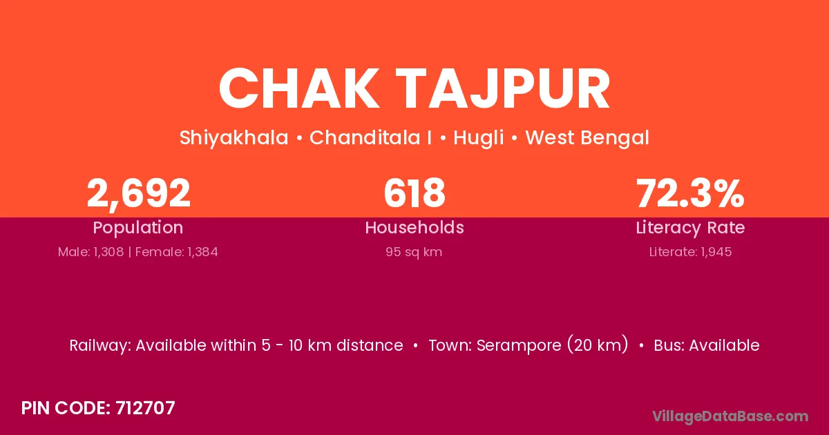 Serampore (20 km) is the nearest town to Chak Tajpur village for major economic activities and is located approximately 20 km away.
