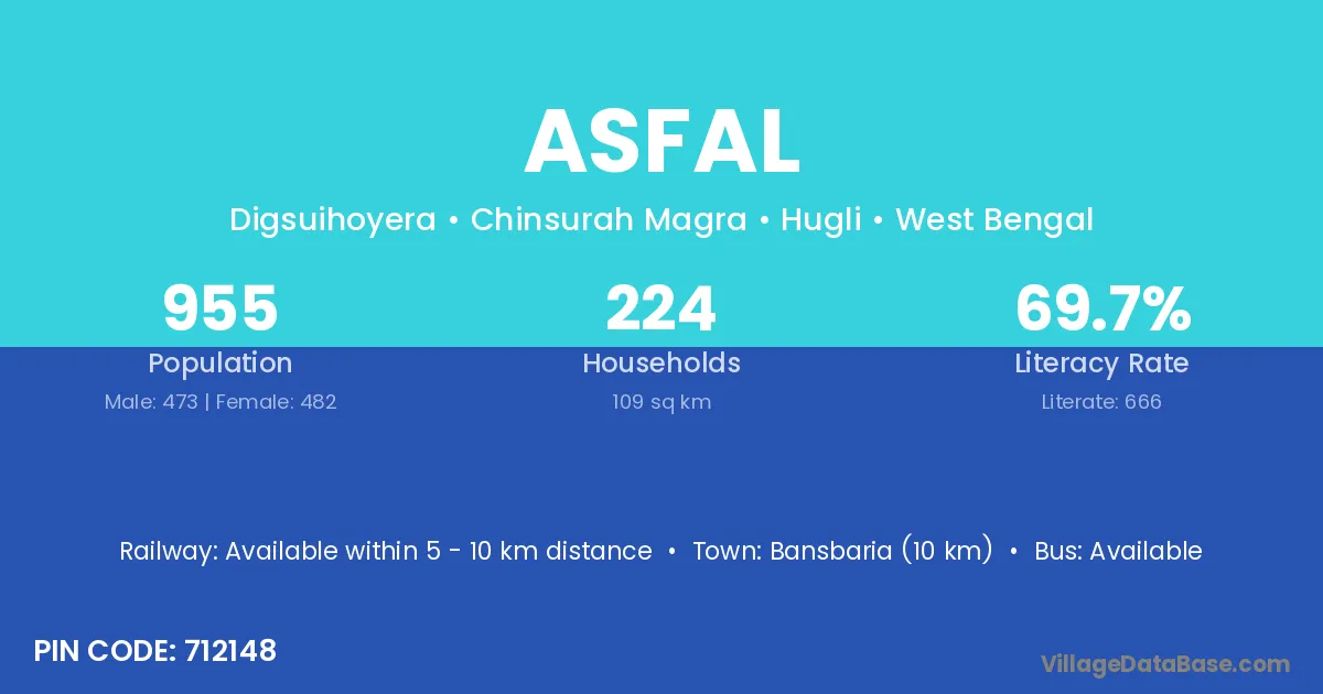 Bansbaria (10 km) is the nearest town to Asfal village for major economic activities and is located approximately 10 km away.