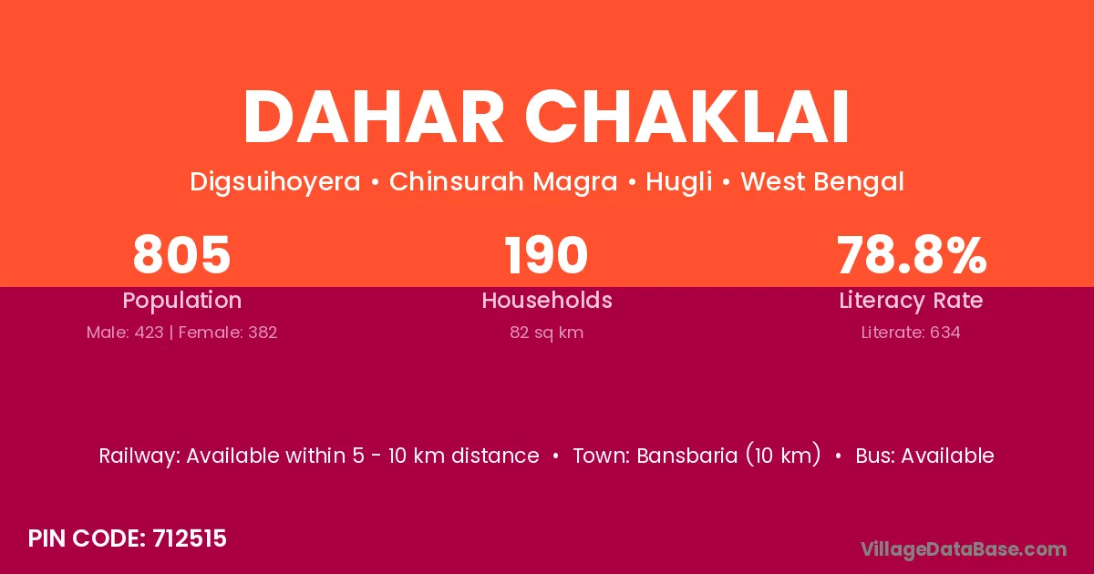 Bansbaria (10 km) is the nearest town to Dahar Chaklai village for major economic activities and is located approximately 10 km away.