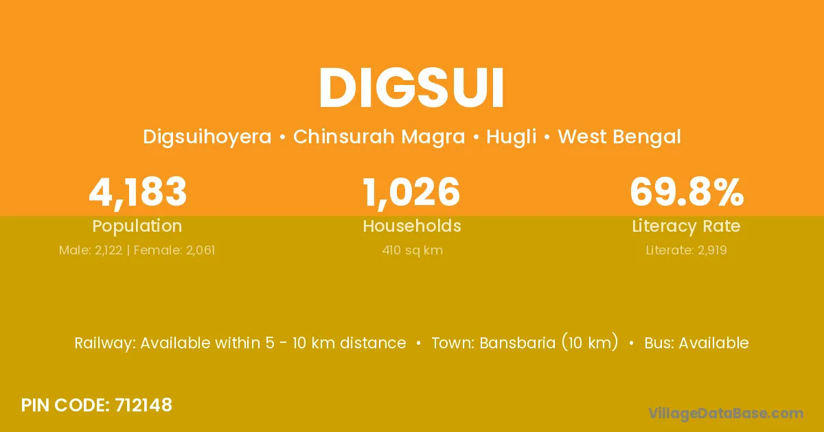 Bansbaria (10 km) is the nearest town to Digsui village for major economic activities and is located approximately 10 km away.