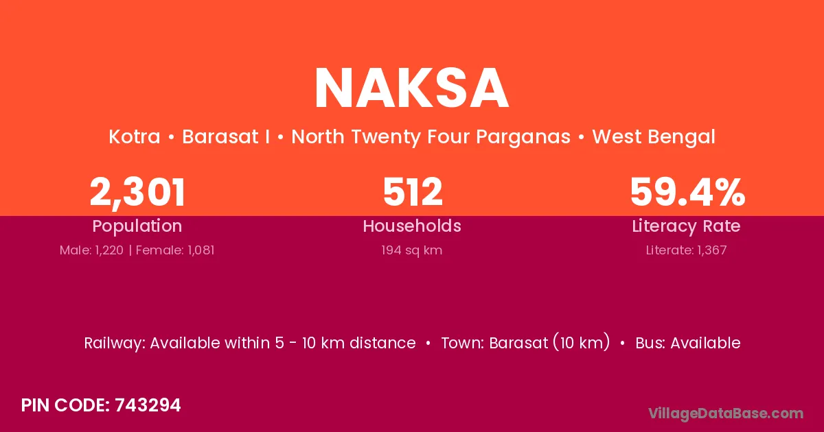 Bansberia (10 km) is the nearest town to Naksa village for major economic activities and is located approximately 10 km away.