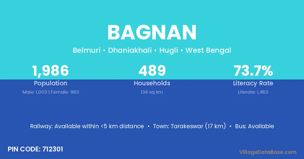 Tarakeswar (17 km) is the nearest town to Bagnan village for major economic activities and is located approximately 17 km away.