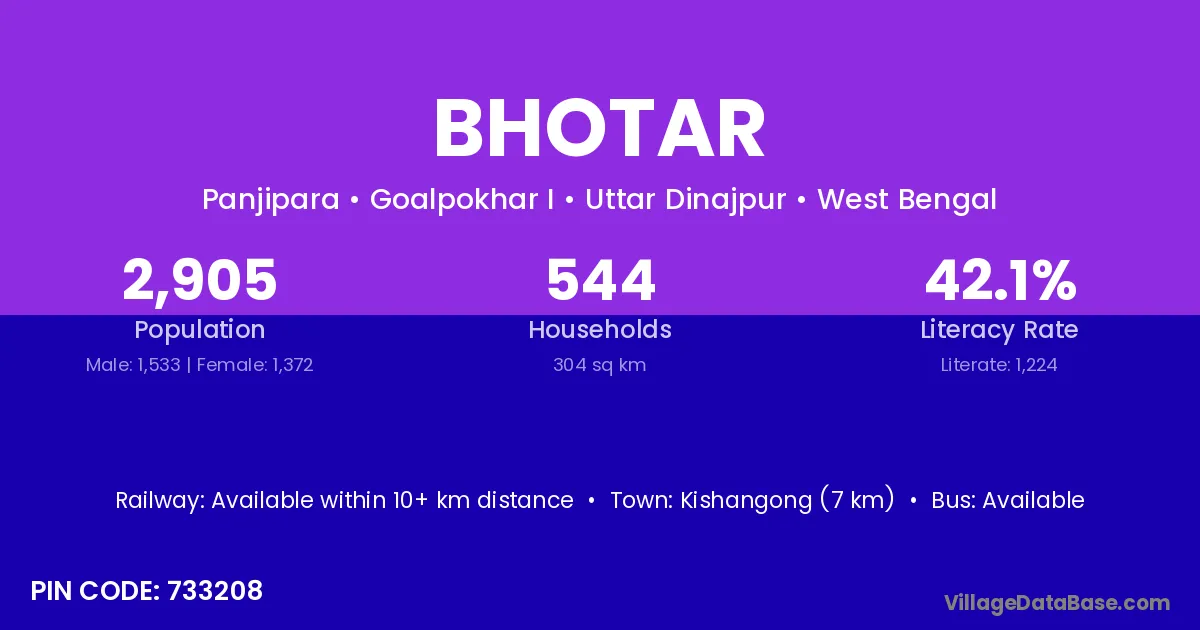 Tarakeswar (32 km) is the nearest town to Bhotar village for major economic activities and is located approximately 32 km away.