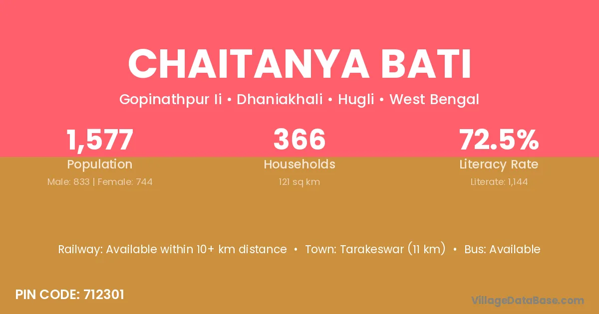 Tarakeswar (11 km) is the nearest town to Chaitanya Bati village for major economic activities and is located approximately 11 km away.