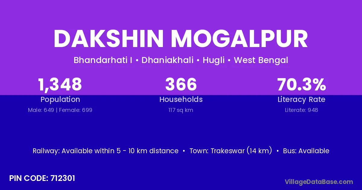 Trakeswar (14 km) is the nearest town to Dakshin Mogalpur village for major economic activities and is located approximately 14 km away.