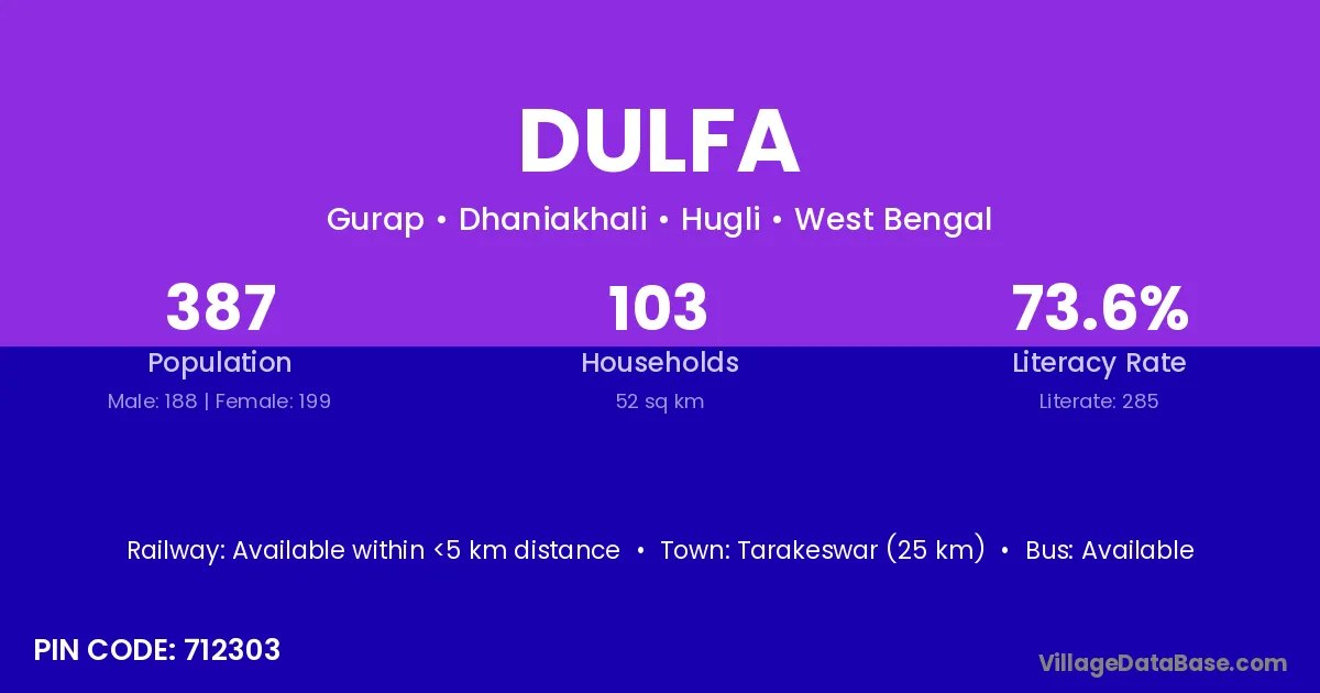 Tarakeswar (25 km) is the nearest town to Dulfa village for major economic activities and is located approximately 25 km away.