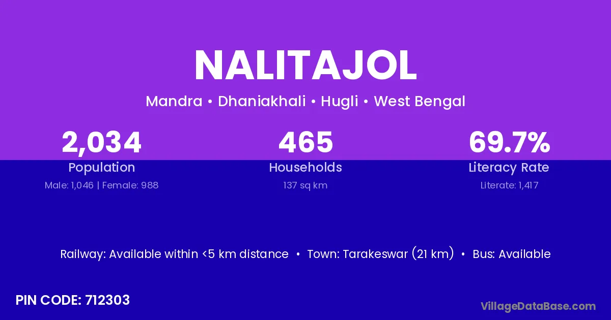 Tarakeswar (21 km) is the nearest town to Nalitajol village for major economic activities and is located approximately 21 km away.