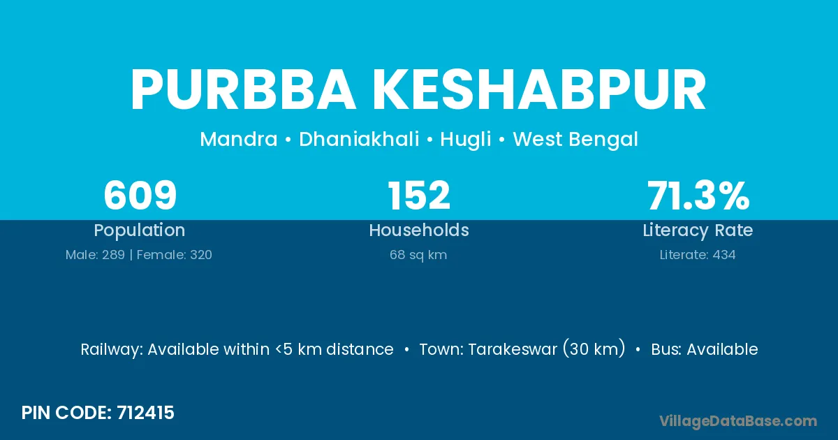 Tarakeswar (30 km) is the nearest town to Purbba Keshabpur village for major economic activities and is located approximately 30 km away.