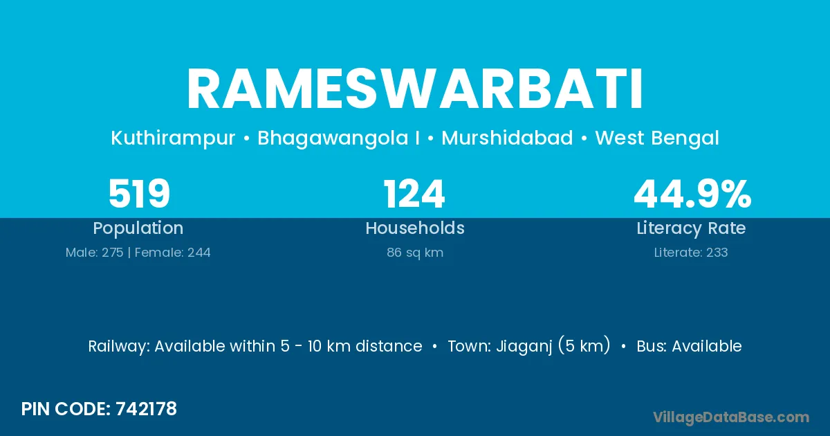 Tarakeswar (25 km) is the nearest town to Rameswarbati village for major economic activities and is located approximately 25 km away.