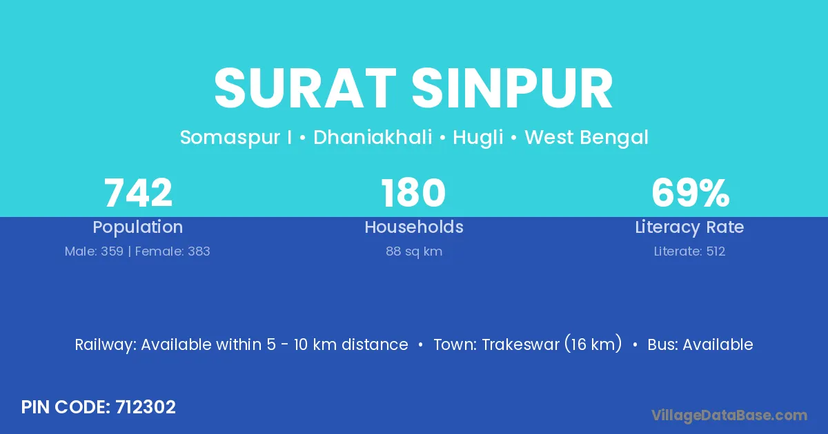 Trakeswar (16 km) is the nearest town to Surat Sinpur village for major economic activities and is located approximately 16 km away.