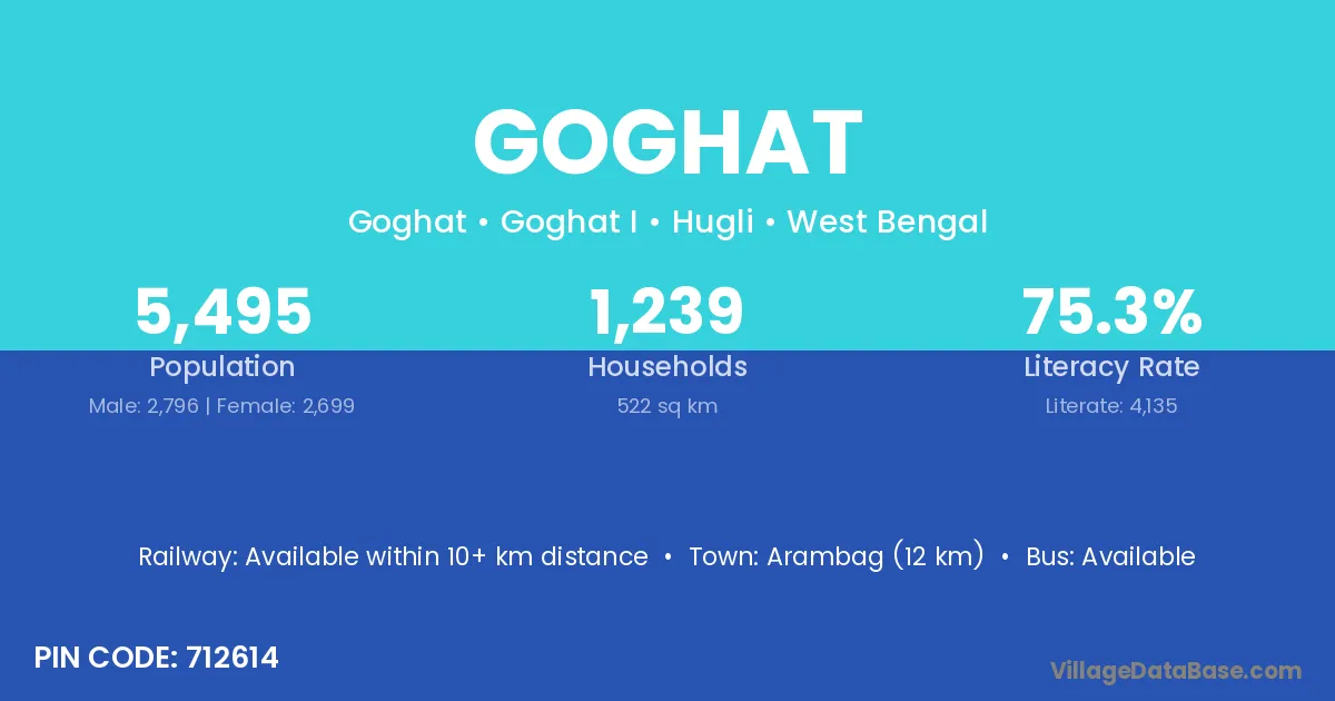 Arambag (12 km) is the nearest town to Goghat village for major economic activities and is located approximately 12 km away.