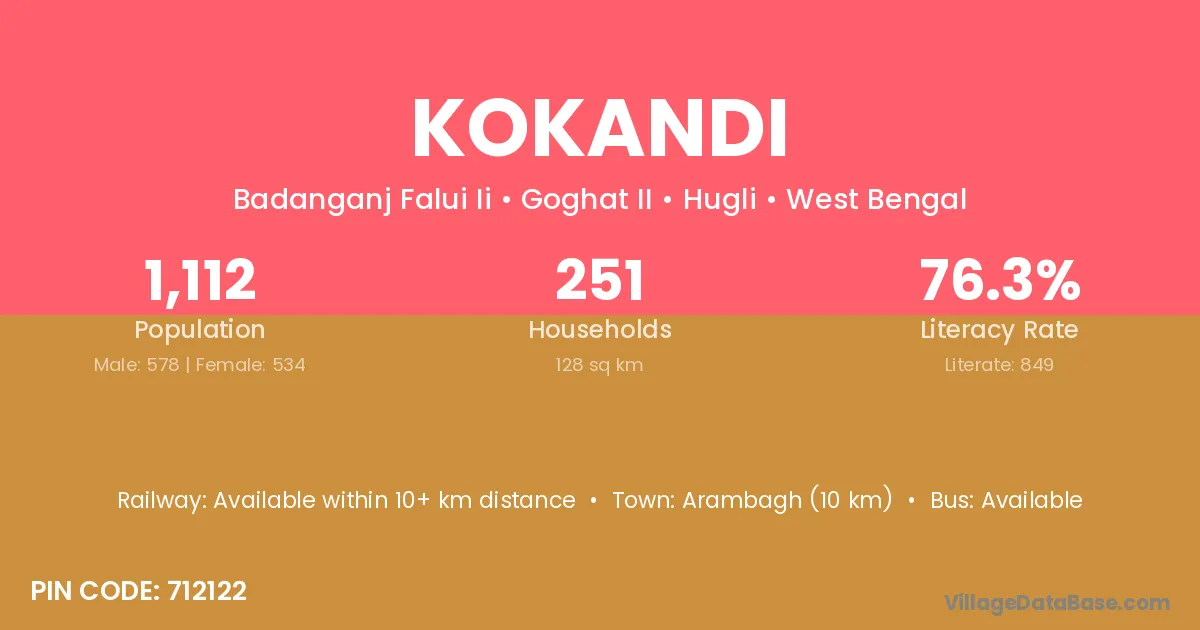Arambagh (10 km) is the nearest town to Kokandi village for major economic activities and is located approximately 10 km away.