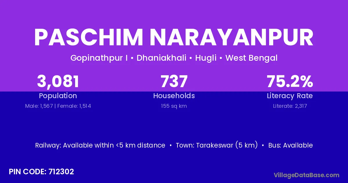 Haripal (10 km) is the nearest town to Paschim Narayanpur village for major economic activities and is located approximately 10 km away.