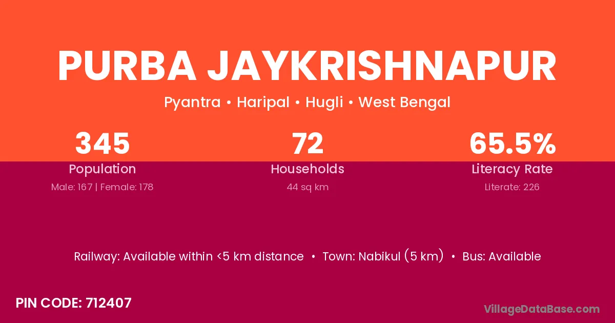 Nabikul (5 km) is the nearest town to Purba Jaykrishnapur village for major economic activities and is located approximately 5 km away.