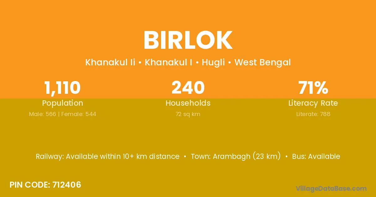 Arambagh (23 km) is the nearest town to Birlok village for major economic activities and is located approximately 23 km away.