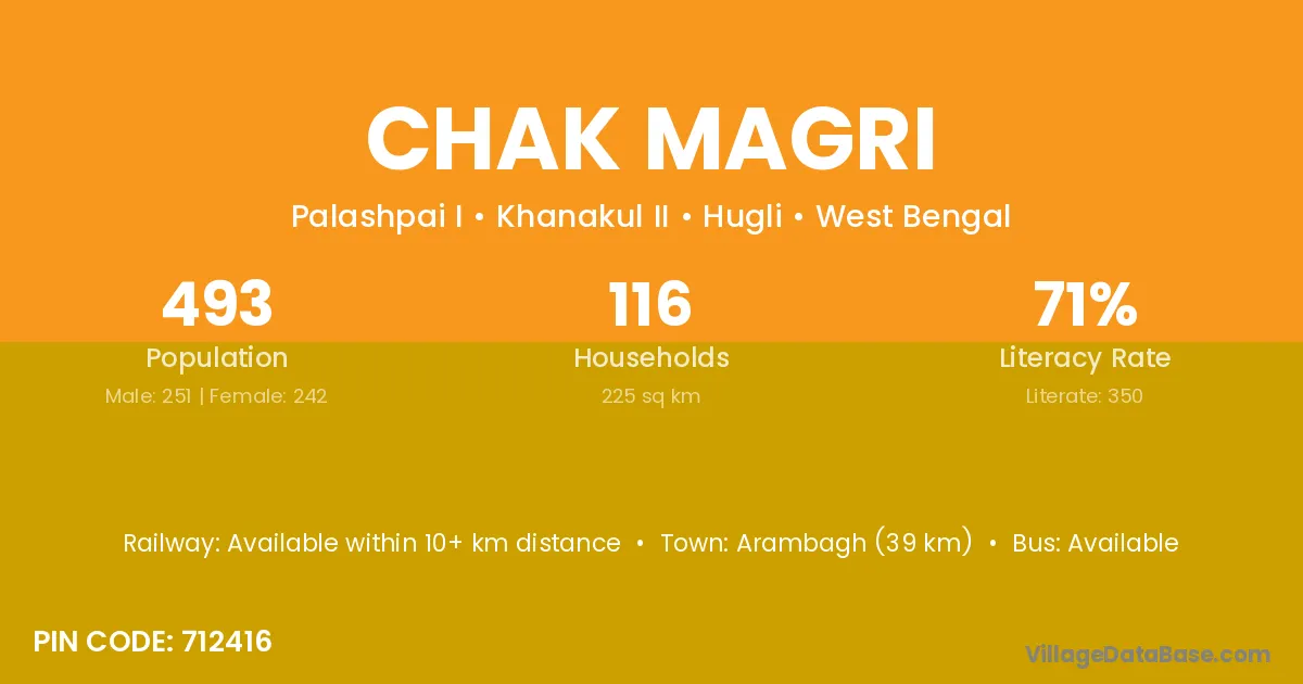 Arambagh (39 km) is the nearest town to Chak Magri village for major economic activities and is located approximately 39 km away.