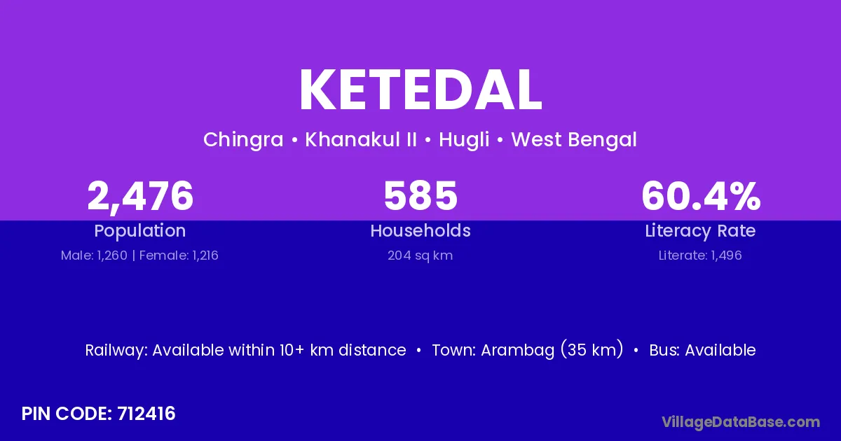 Arambag (35 km) is the nearest town to Ketedal village for major economic activities and is located approximately 35 km away.