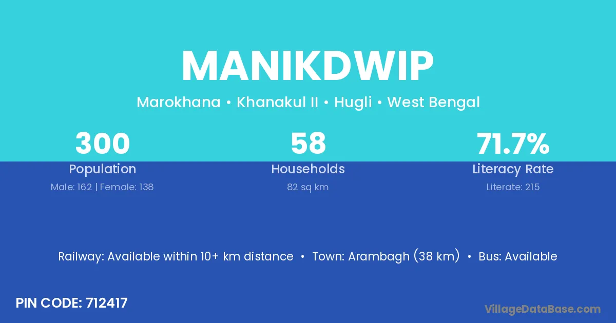 Arambagh (38 km) is the nearest town to Manikdwip village for major economic activities and is located approximately 38 km away.