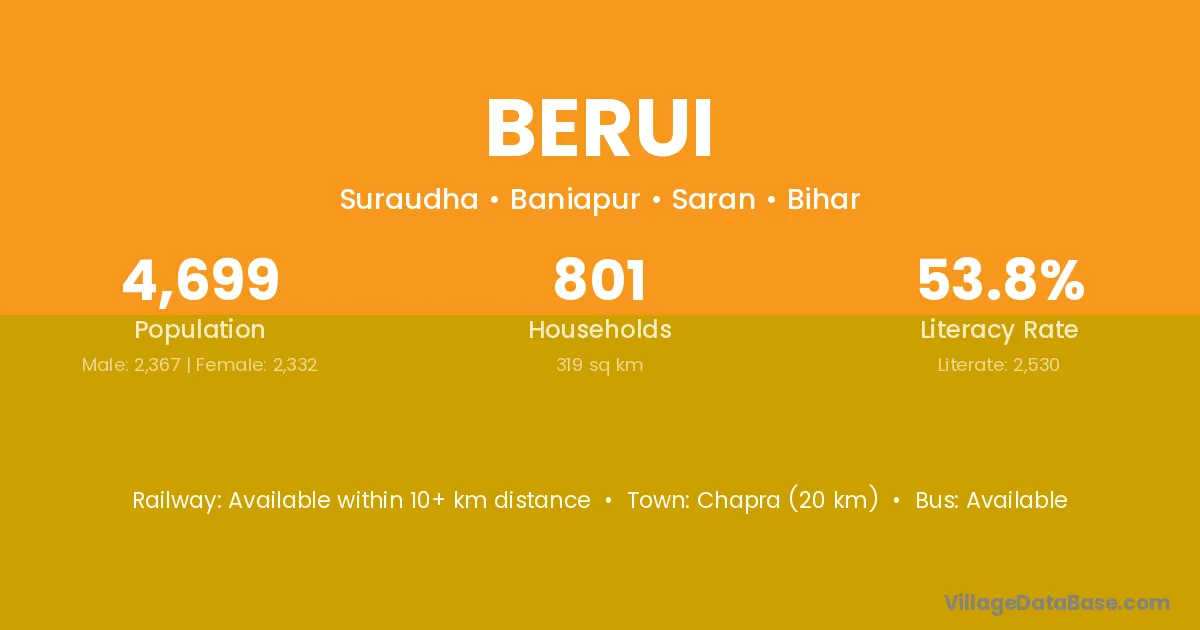 Chinsura (11 km) is the nearest town to Berui village for major economic activities and is located approximately 11 km away.