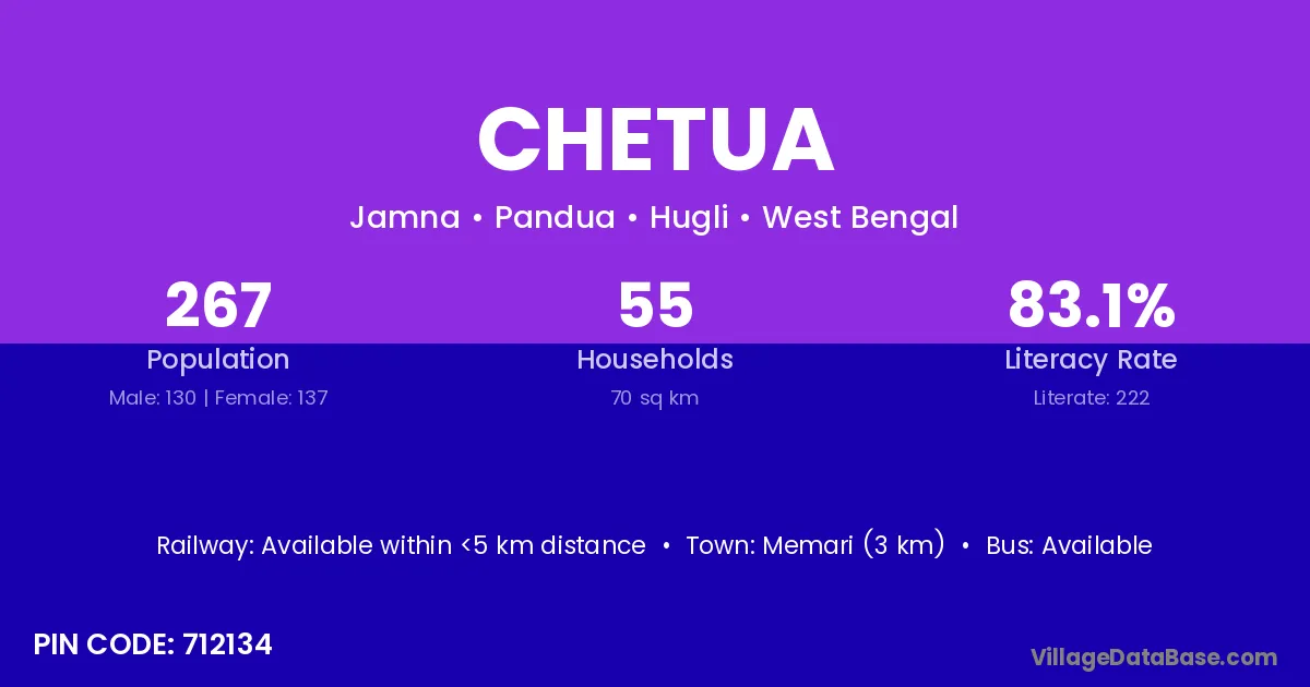According to Census 2011 information, the village code of Chetua village is 712134.