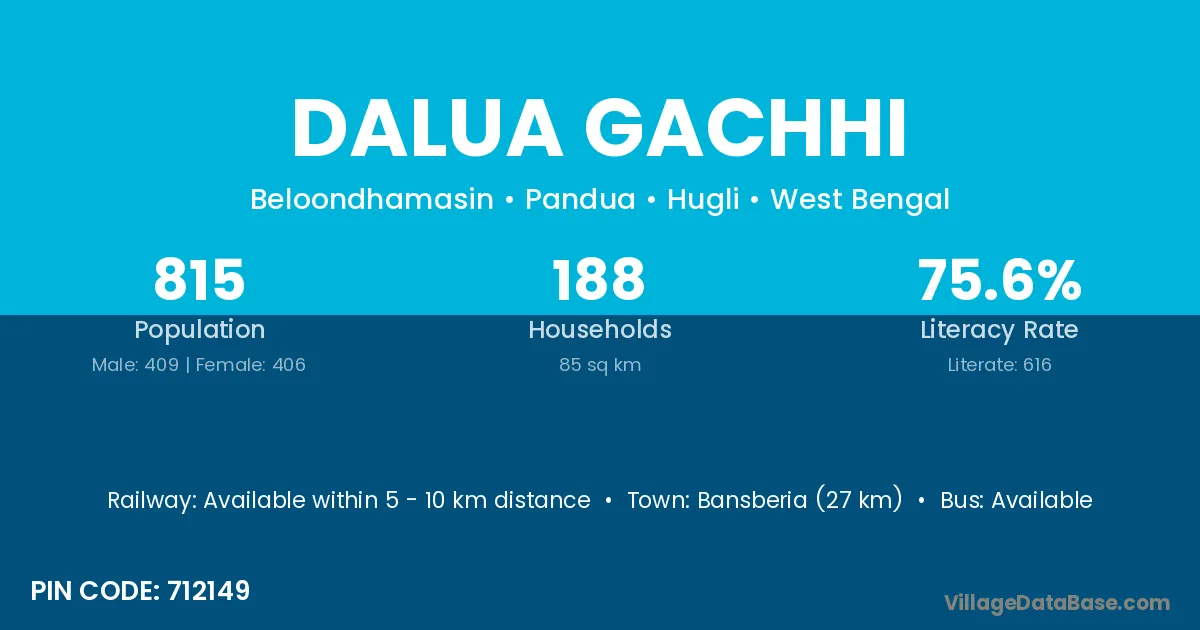 Bansberia (27 km) is the nearest town to Dalua Gachhi village for major economic activities and is located approximately 27 km away.