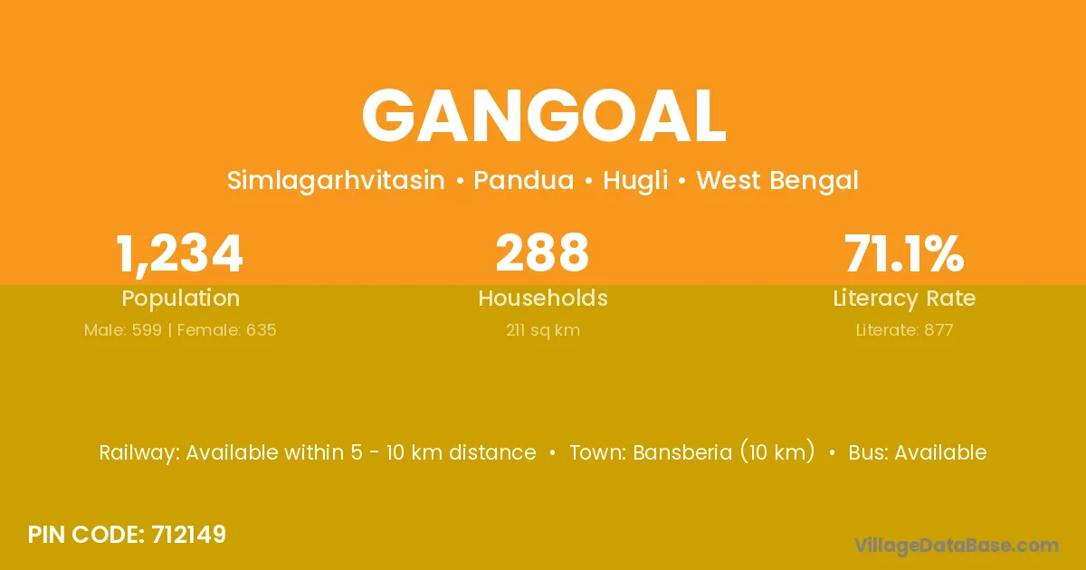 Bansberia (10 km) is the nearest town to Gangoal village for major economic activities and is located approximately 10 km away.