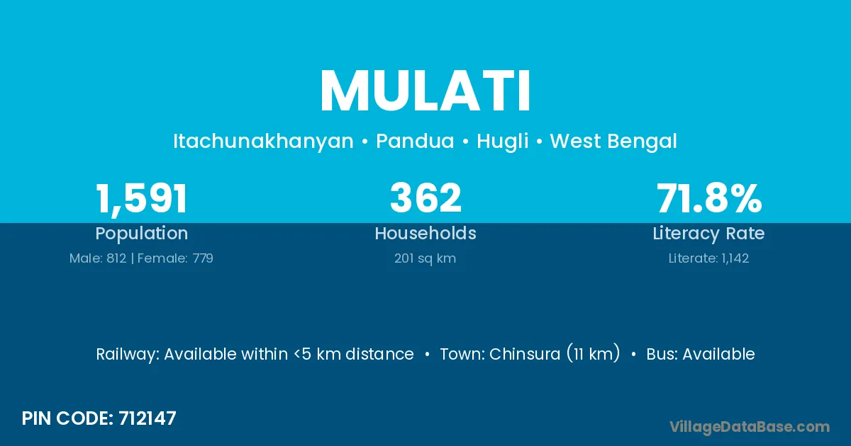 Chinsura (11 km) is the nearest town to Mulati village for major economic activities and is located approximately 11 km away.
