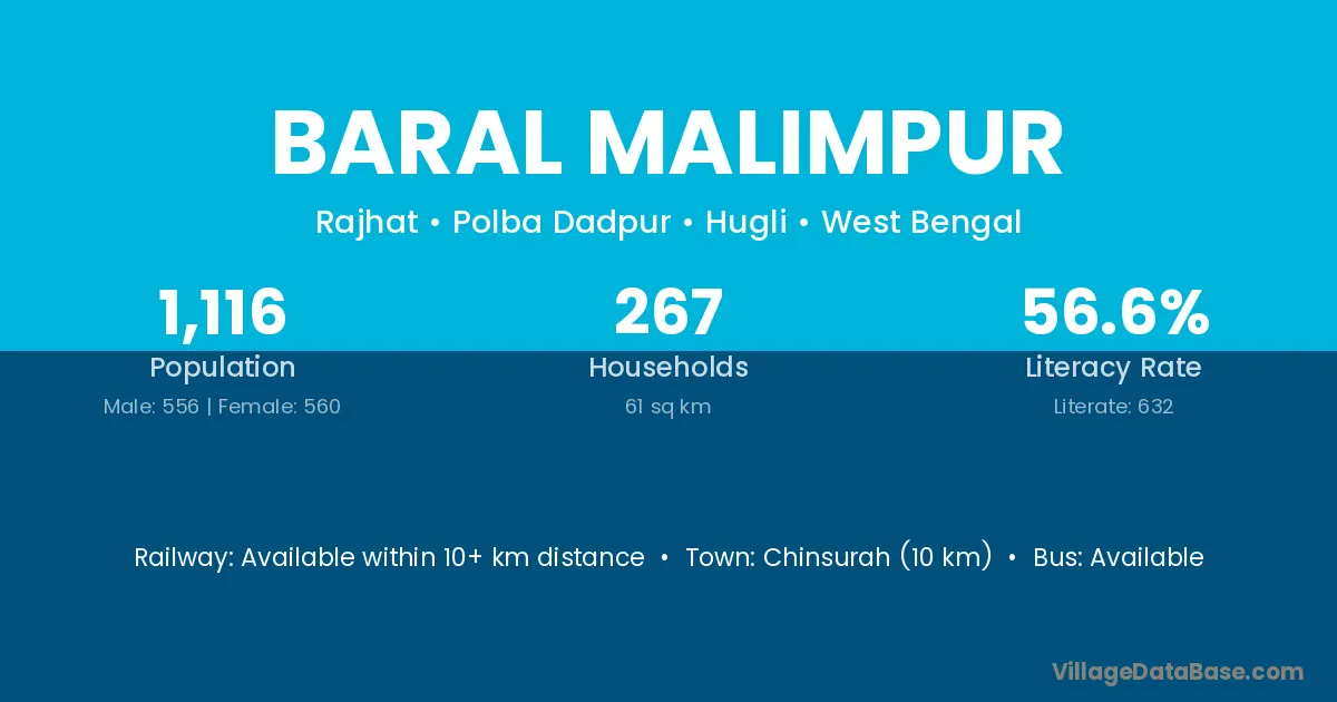 Chinsurah (10 km) is the nearest town to Baral Malimpur village for major economic activities and is located approximately 10 km away.