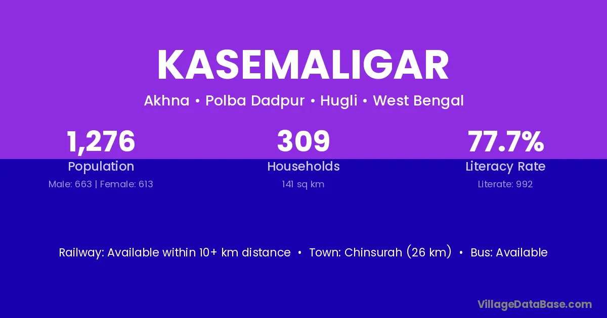 Chinsurah (26 km) is the nearest town to Kasemaligar village for major economic activities and is located approximately 26 km away.