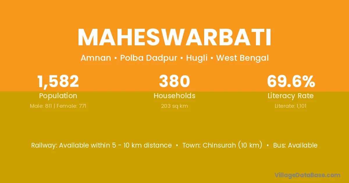 Chinsurah (10 km) is the nearest town to Maheswarbati village for major economic activities and is located approximately 10 km away.