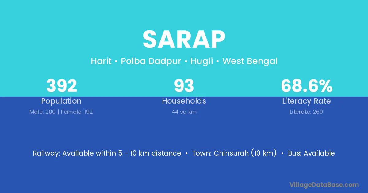 Chinsurah (10 km) is the nearest town to Sarap village for major economic activities and is located approximately 10 km away.