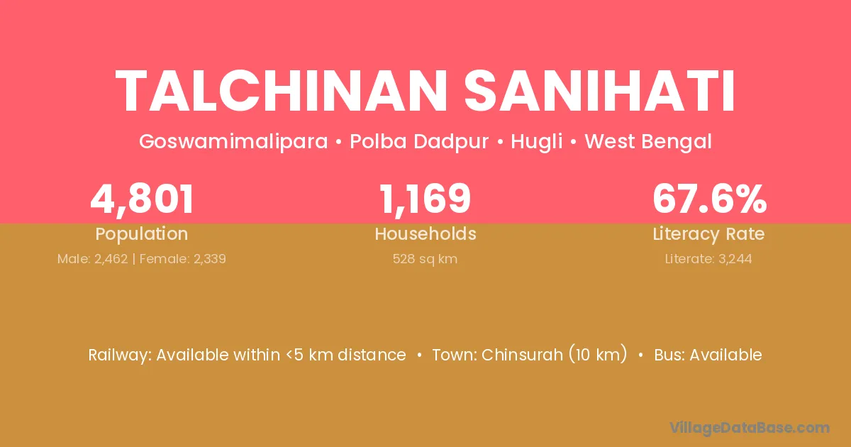 Chinsurah (10 km) is the nearest town to Talchinan Sanihati village for major economic activities and is located approximately 10 km away.