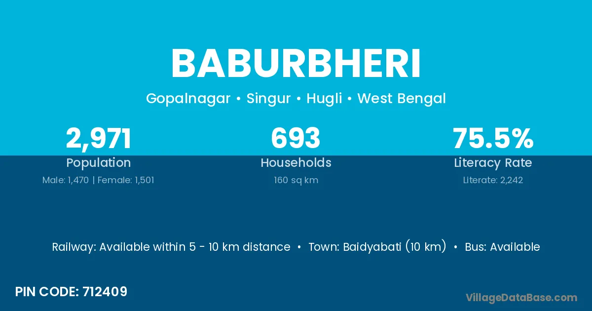 Baidyabati (10 km) is the nearest town to Baburbheri village for major economic activities and is located approximately 10 km away.
