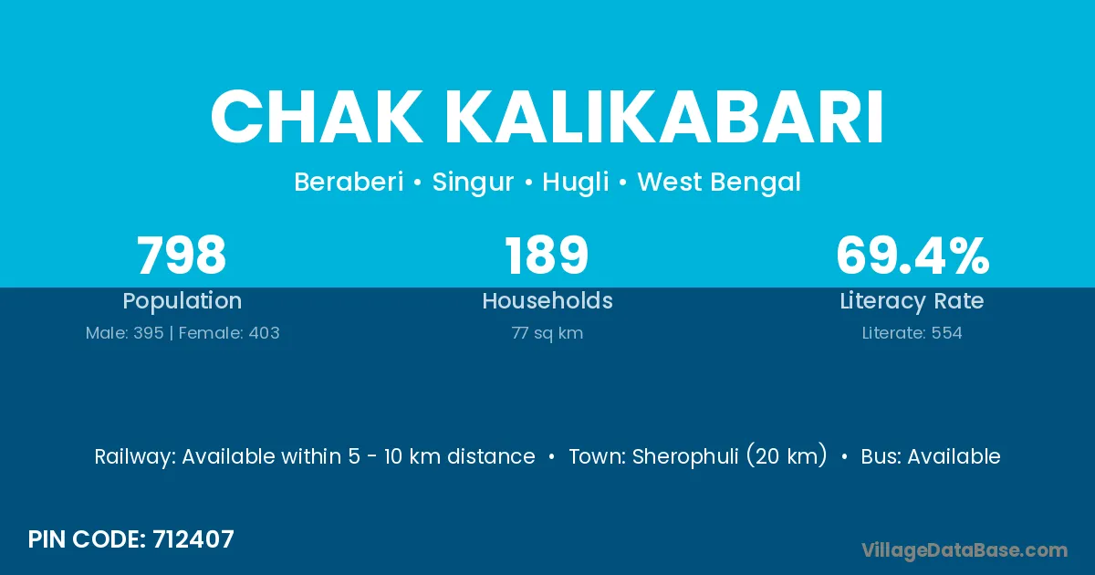 Sherophuli (20 km) is the nearest town to Chak Kalikabari village for major economic activities and is located approximately 20 km away.
