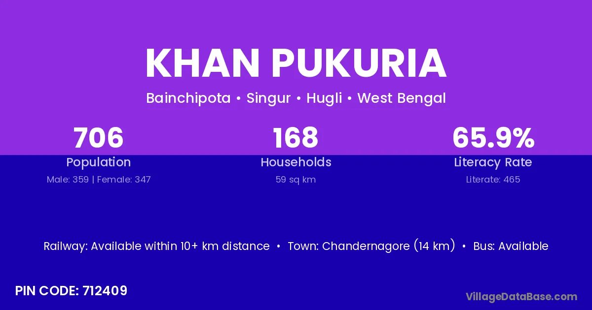 Chandernagore (14 km) is the nearest town to Khan Pukuria village for major economic activities and is located approximately 14 km away.