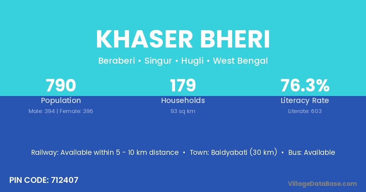 Baidyabati (30 km) is the nearest town to Khaser Bheri village for major economic activities and is located approximately 30 km away.