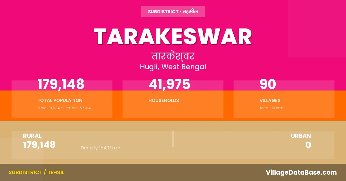 According to the 2011 census The total area of Tarakeswar Subdivision is 116 km², with a population of 179148 people. The population density is 1,540 inhabitants per square kilometre, and there are approximately 41975 houses in the sub district.