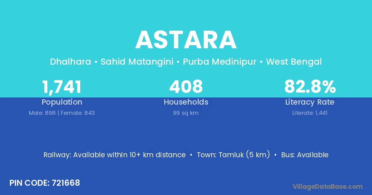 Tarakeswar (7 km) is the nearest town to Astara village for major economic activities and is located approximately 7 km away.