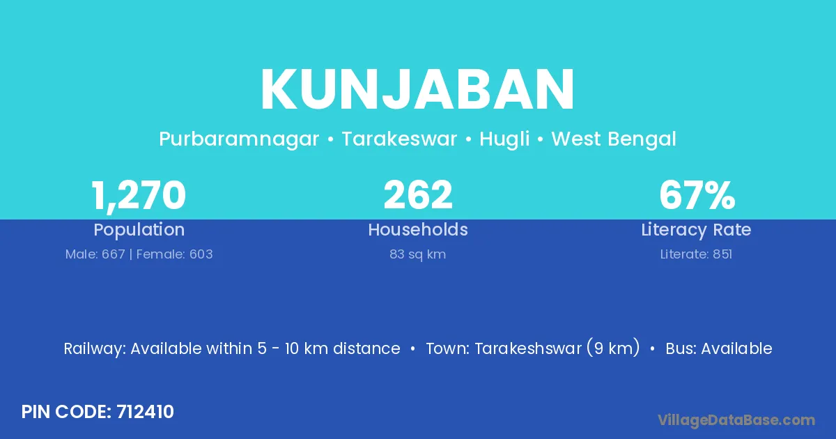 Tarakeshswar (9 km) is the nearest town to Kunjaban village for major economic activities and is located approximately 9 km away.