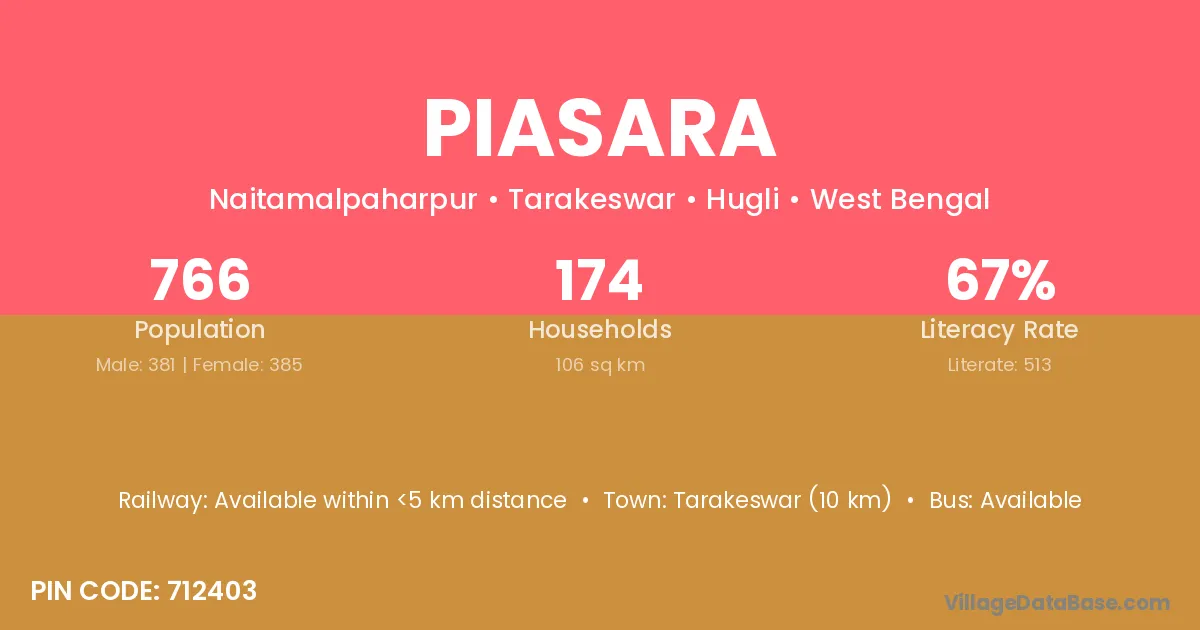 Tarakeswar (10 km) is the nearest town to Piasara village for major economic activities and is located approximately 10 km away.