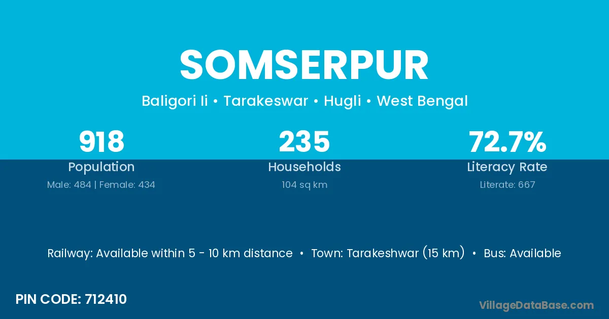 Tarakeshwar (15 km) is the nearest town to Somserpur village for major economic activities and is located approximately 15 km away.