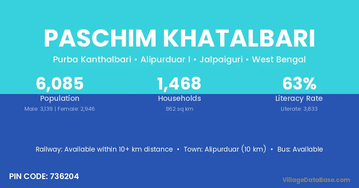 Paschim Khatalbari village has a total population of 6,085 people, of which 3,139 are males and 2,946 are females.