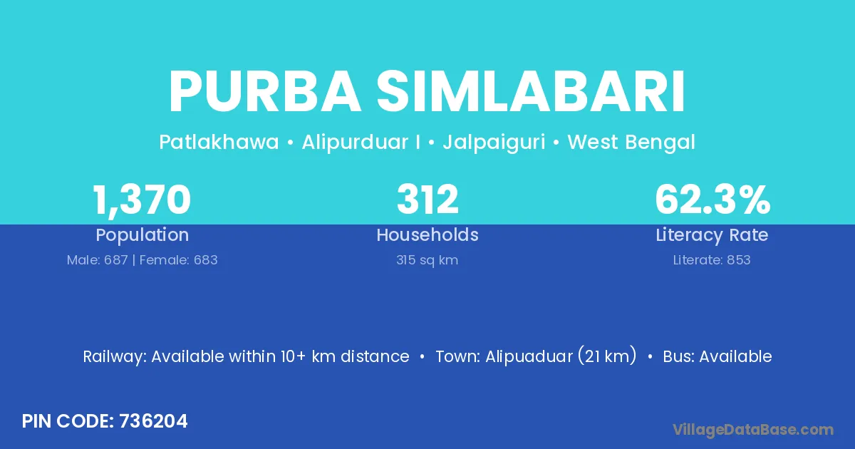 Alipuaduar (21 km) is the nearest town to Purba Simlabari village for major economic activities and is located approximately 21 km away.